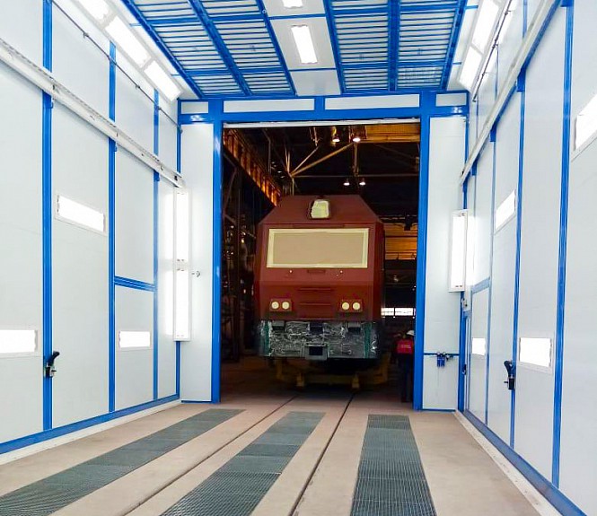 Исполнение проходное. Размеры внутренние камеры составляют: 22 х 6,3 х 7 м. Назначение камеры – подготовка поверхности изделий, окрашивание кузовов электровозов, нанесение ЛКП, а также сушка поверхности при повышенной температуре.